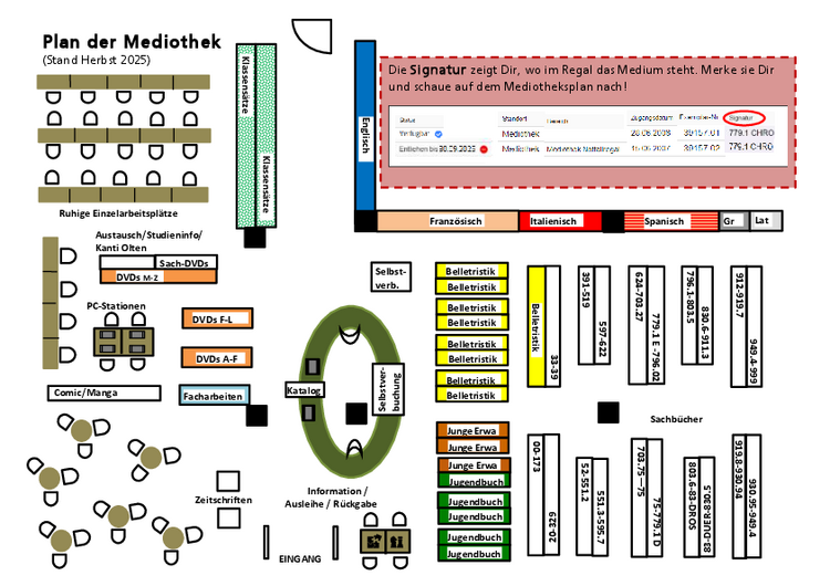 Für die Ausleihe ist der Schüler- resp. Benutzungsausweis nötig, erwünscht ist er bei der Rückgabe an der Theke. Details zur Ausleihe finden sich im Reglement der Mediothek.